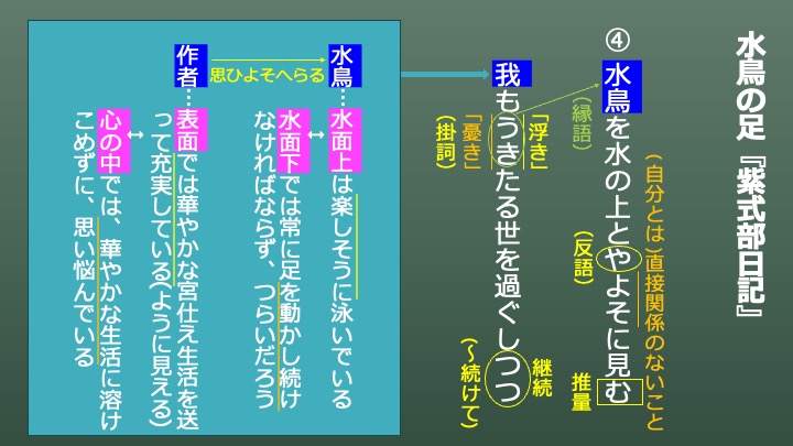 ここで、なぜ「よそのこと(自分とは関係のないもの)」と見ることができないかをもう少し深く考えます。「水鳥」は、水面上は楽しそうに泳いでいるが、水面下では足を常に動かし続けなくてはならない。それはつらいだろうと作者は考えます。一方で「自分」は、表面ではは華やかな宮仕え生活を送って充実しているように見えるが、心の中ではそんな生活に溶け込めずに思い悩んでいる。そんな自分と水鳥は同じようなものだと考えてこの和歌を詠んだのでしょう。後の文で、「思ひよそへらる(我が身に自然と思い比べられる)」と言っています。