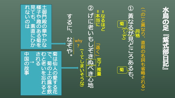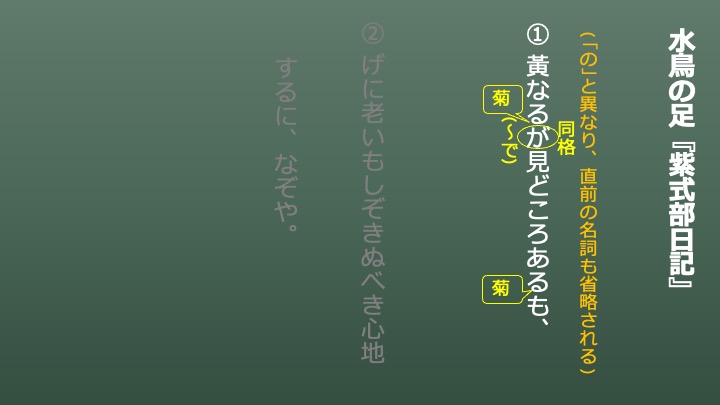 「黃なるが見どころあるも」は、「が」の用法が問題になります。実はこの「が」は、『源氏物語』の「光る君誕生(桐壺)」に出てきています。同格の「が」と呼ばれるものです。これは、「が」の前の「黄なる」と後ろの「見どころある」が同じものを指していることを表す格助詞です。ただ、どちらも「何」のことを言っているのかは省略されています。同格の「の」は前の部分に名詞が書かれていたので、「何」のことかは分かりました。ですが、「が」はそれすらも文章の内容から判断する必要が出てくるわけです。今回は「菊」の話をしているので、省略されている語は「菊」だと分かります。