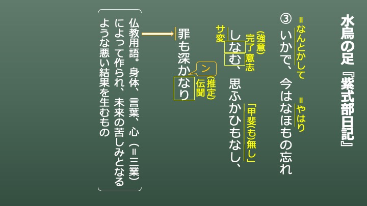 「罪も深かなり」は、読むときには「罪も深かんなり」となります。撥音便の無表記によって「深かなり」となっています。撥音便の無表記のあとの「なり」は伝聞推定の助動詞「なり」になります。よって、「罪も深いそうだ」と解釈できます。作者は思い悩むことは「罪が深い」と考えています。これは仏教における「罪」の考え方がもとになっており、「罪」とは「身体、言葉、心(=三業)によって作られ、未来の苦しみとなるような悪い結果を生むもの」とされていました。作者は思い悩み続けると、未来永劫苦しみ続けると考えたのでしょうか。この思い悩みを断ち切りたいと思ってこのようなことを書き記したのでしょう。