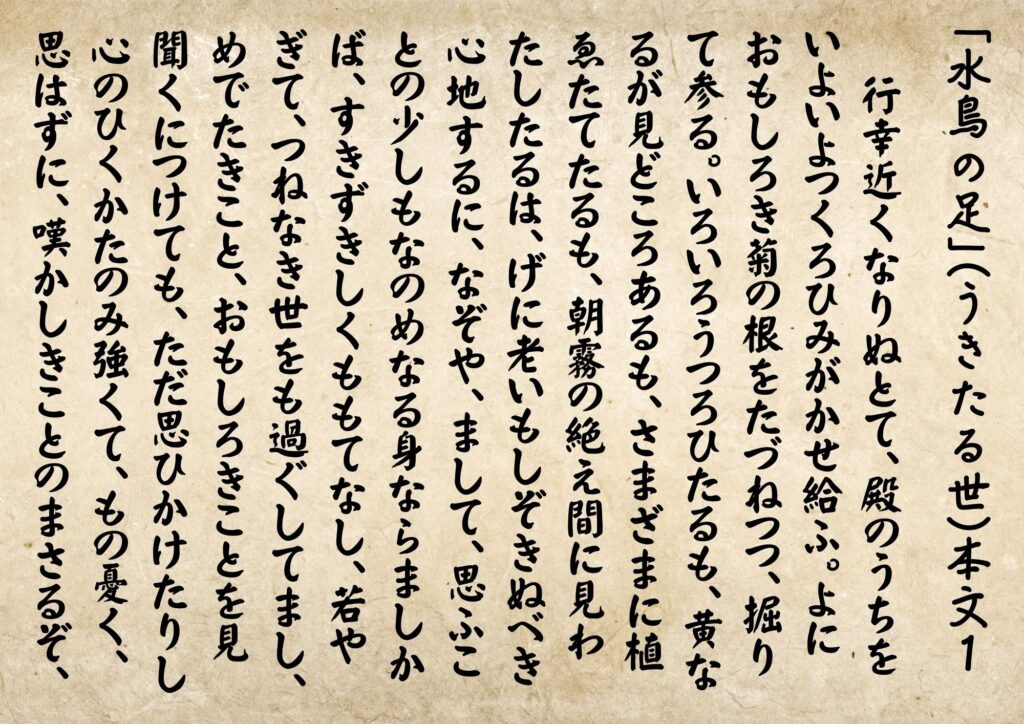 行幸(ぎやうがう)近くなりぬとて、殿(との)のうちをいよいよつくろひみがかせ給ふ。よにおもしろき菊の根をたづねつつ、掘りて参る。いろいろうつろひたるも、黄(き)なるが見どころあるも、さまざまに植(う)ゑたてたるも、朝霧(あさぎり)の絶え間に見わたしたるは、げに老いもしぞきぬべき心地するに、なぞや、まして、思ふことの少しもなのめなる身ならましかば、すきずきしくももてなし、若やぎて、つねなき世をも過ぐしてまし、めでたきこと、おもしろきことを見聞くにつけても、ただ思ひかけたりし心のひくかたのみ強くて、もの憂く、思はずに、嘆かしきことのまさるぞ、いと苦しき。いかで、今はなほもの忘れしなむ、思ふかひもなし、罪も深かなりなど、明けたてばうちながめて、水鳥どもの思ふことなげに遊びあへるを見る。