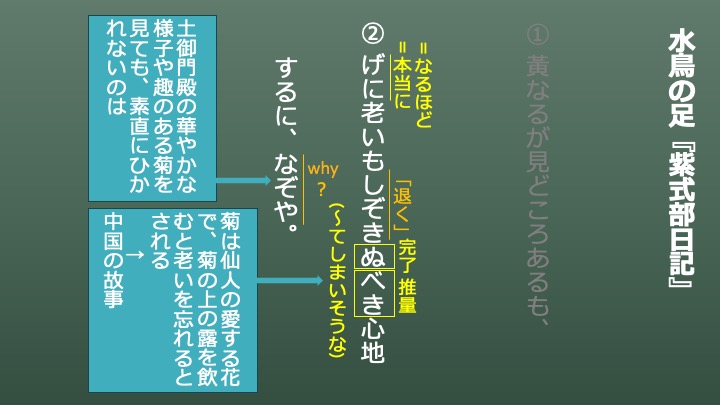 「げに」は「なるほど/本当に」という意味を表す語でした。「老いもしぞきぬべき心地」の「しぞき」は漢字を当てると「退き」となります。「ぬ」は完了の助動詞「ぬ」の終止形、「べし」は推量の助動詞「べし」の連体形と判断し、「〜てしまいそうな」と解釈しておきます。そうすると、「老いも退散してしまいそうな気持ち」と解釈できます。「菊を見ると老いが退散する」という因果関係が奇妙ですが、これはある中国の故事を元にして発言しているのです。それは、「菊は仙人の愛する花で、菊の上の露を飲むと老いを忘れる」というものです。それを踏まえて、作者は「老いも退散してしまいそう」と言ったのです。
