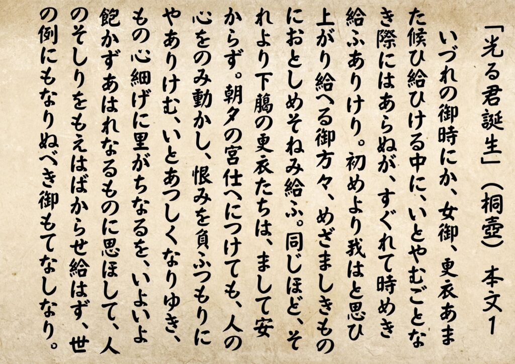 いづれの御時(おほんとき)にか、女御(にようご)、更衣(かうい)あまた候(さぶら)ひ給(たま)ひける中に、いとやむごとなき際(きは)にはあらぬが、すぐれて時めき給ふありけり。初めより我はと思ひ上がり給へる御方々(おほんかたがた)、めざましきものにおとしめそねみ給ふ。同じほど、それより下﨟(げらふ)の更衣たちは、まして安からず。朝夕(あさゆふ)の宮仕(みやづか)へにつけても、人の心をのみ動かし、恨みを負(お)ふつもりにやありけむ、いとあつしくなりゆき、もの心細げに里がちなるを、いよいよ飽(あ)かずあはれなるものに思ほして、人のそしりをもえはばからせ給はず、世の例(ためし)にもなりぬべき御(おほん)もてなしなり。(『源氏物語』より)